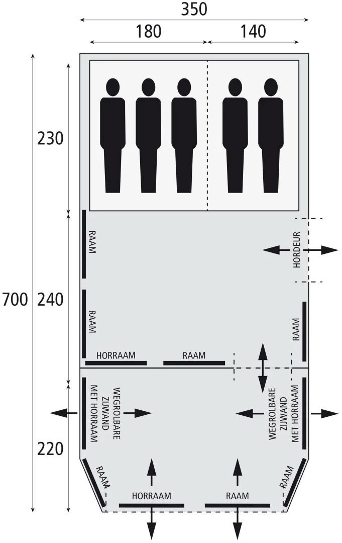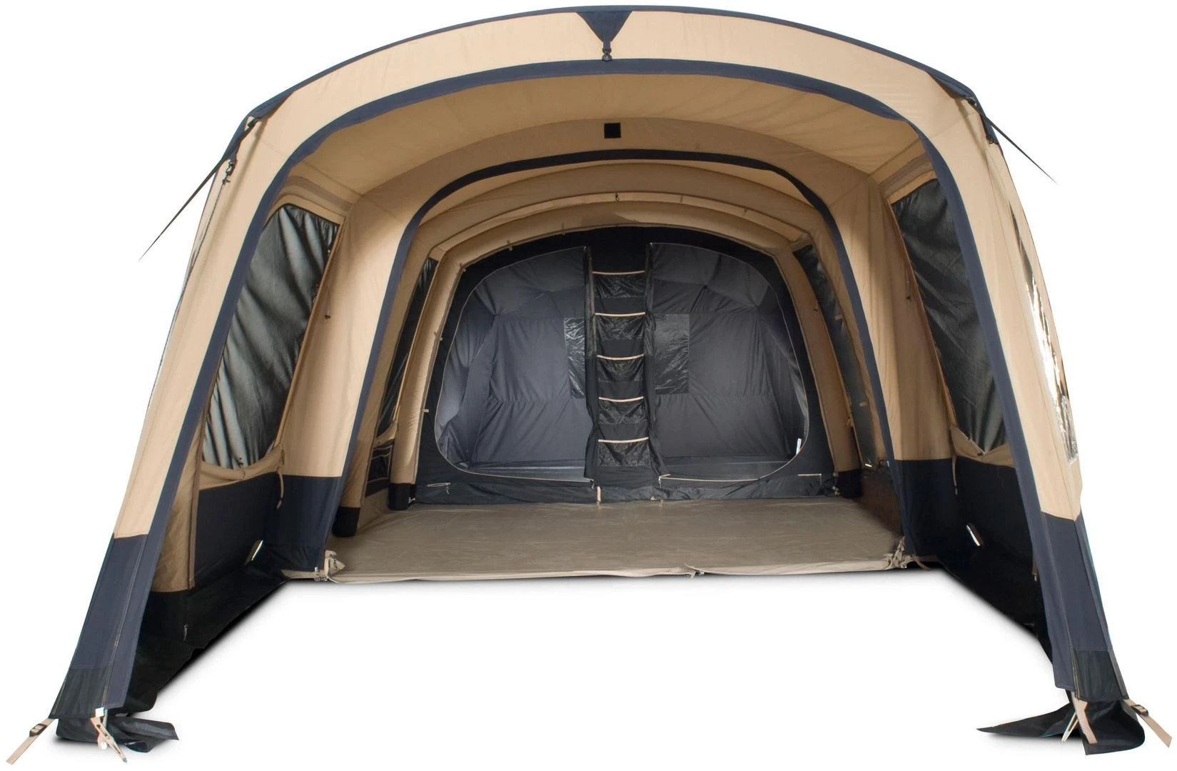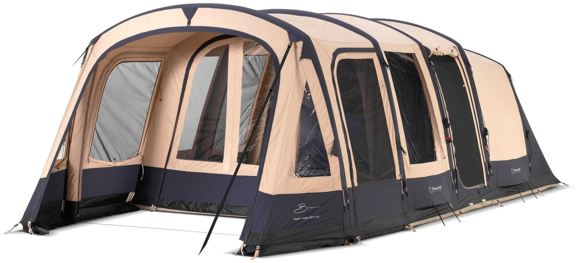 De Bardani Royal Prestige 350 Air RSC opblaasbare tent is een luxe, rechtwandige oppomptent met extra grote ramen. De tent heeft twee slaapcabines die ruimte bieden voor vijf personen. Deze katoenen tent heeft een afsluitbare luifel.