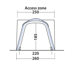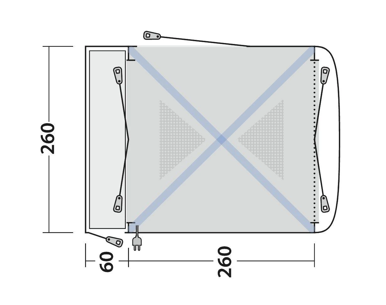 Das freistehende Busvorzelt Milestone Shade Air ist mit seiner kompakten Größe von 260 x 260cm die ideale Wahl für kleinere Stellplätze. Es lässt sich schnell über nur ein Ventil komplett aufblasen. Der große Fronteingang unter dem abgerundeten Vordach ist mit einem Moskitonetz ausgestattet und die durch Netzstoff geschützte Belüftungsöffnung in der Spitze verbessert das Klima im Zelt. Neben der Zelt-Seitentür befindet sich eine weitere Tür in der Vorzeltschleuse. Das Vorzelt kann allein auf dem Platz stehen bleiben. Die Schleuse lässt sich über das Kederprofil (5 + 7mm) oder mit Leinen am Bus schnell befestigen oder es kann leicht wieder gelöst werden. Es ist ein optionales Innenzelt für 2 Personen erhältlich.