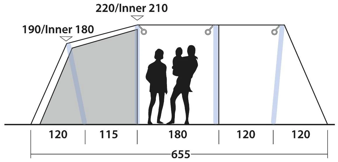 Das Parkdale 6PA beherbergt sechs Personen in drei Premier-Schlafkabinen mit Panorama-Aussicht. Es verfügt über drei Zonen, wobei die Verbindungen zwischen den inneren und äußeren Zonen mit dem Quick & Quiet Access versehen sind. Die vorgebogenen Luftschläuche maximieren den nutzbaren Innenraum und die zahlreichen Fenster lassen reichlich Licht ins Zelt. Das Rear Ventilation System bietet verschiedene Belüftungsmöglichkeiten: von vollständig geöffnet bis dicht verschlossen dank Reißverschluss