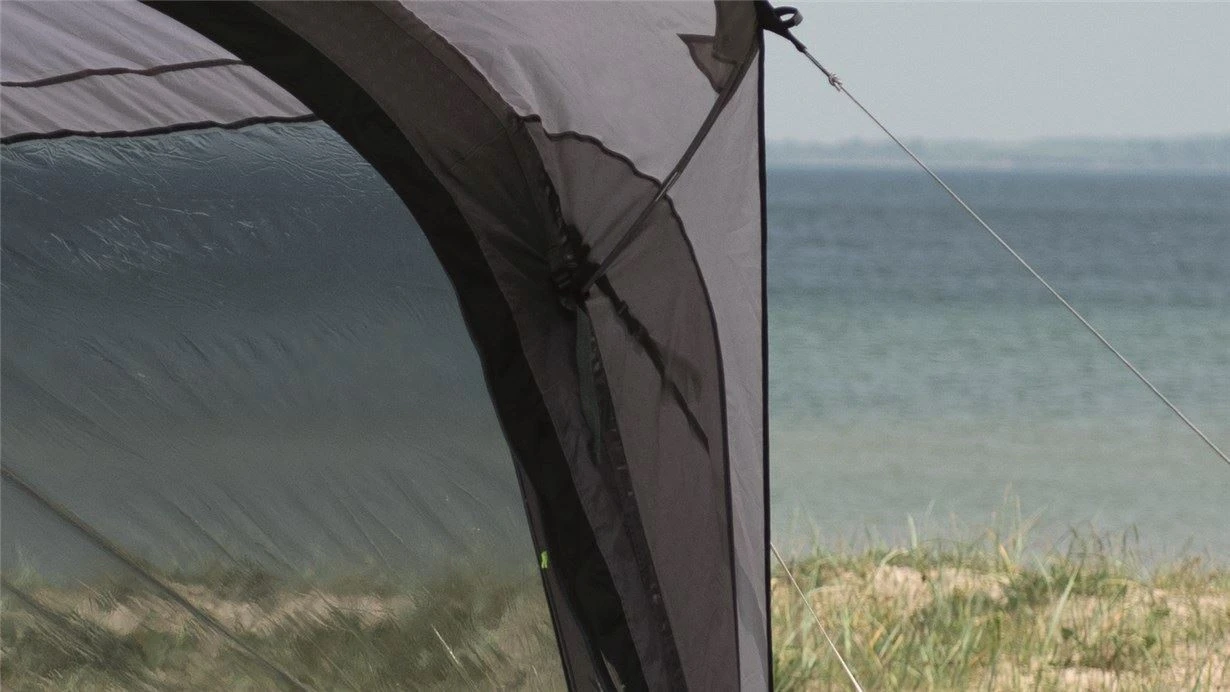 Für Reisemobile mit einer Anschlusshöhe von 270-300cm schafft das aufblasbare freistehende Parkville 200SA Xtra Tall einen großartigen lichtdurchfluteten Raum. Die Verbindungsschleuse kann entweder mit dem Doppelkeder in die vorhandene Markise befestigt werden oder man nützt die langen Leinen und spannt die Schleuse über das Dach des Fahrzeuges. Die mit Moskitonetz ausgestattete Frontwand mit Fenstern wird von einem Vordach geschützt und kann mit vier Reißverschluss-Schiebern vollständig geöffnet werden, um einen Verandabereich zu schaffen. Zudem befinden sich in der Verbindungsschleuse zwei weitere Eingänge. Für diesen Bereich ist eine zusätzliche Bodenplane inklusive Schürze beinhaltet, was die Schleuse als verlängerten Innenraum sinnvoll nutzbar macht.
