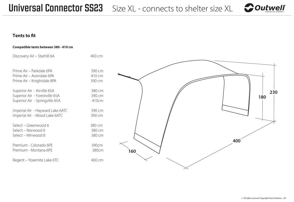 Bieten Sie einen überdachten zentralen Wohnbereich für gemeinsame Mahlzeiten und Geselligkeit, indem Sie Outwell-Zelte über eine Outwell-Sommer- oder Veranstaltungslounge miteinander verbinden. Der Universalverbinder kann eine Lounge an ein Zelt anschließen, um ein längeres, geschütztes Leben im Freien zu ermöglichen, das Komfort und Bequemlichkeit erhöht.