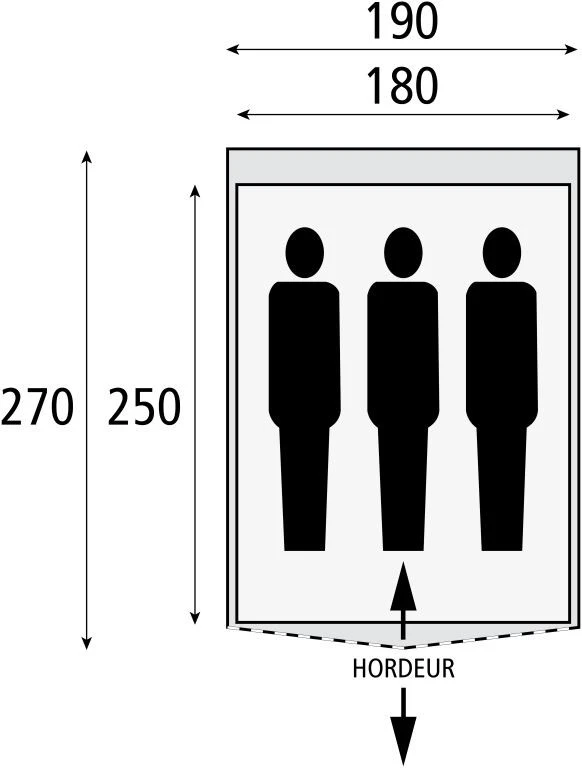 Das Cyclone L Zelt hat eine Größe von 270 x 190 Zentimetern. Der Schlafbereich hat eine Größe von 250 x 180 cm. Das macht dieses Zelt groß genug für drei Personen. Das Zelt hat eine Vordertür, die leicht zu öffnen und zu schließen ist. Das Horn verhindert das Betreten des Zeltes durch Insekten. Darüber hinaus sorgt das Horn in Kombination mit den verwendeten Materialien für eine ausreichende Belüftung, wodurch sich die Temperatur angenehm anfühlt.